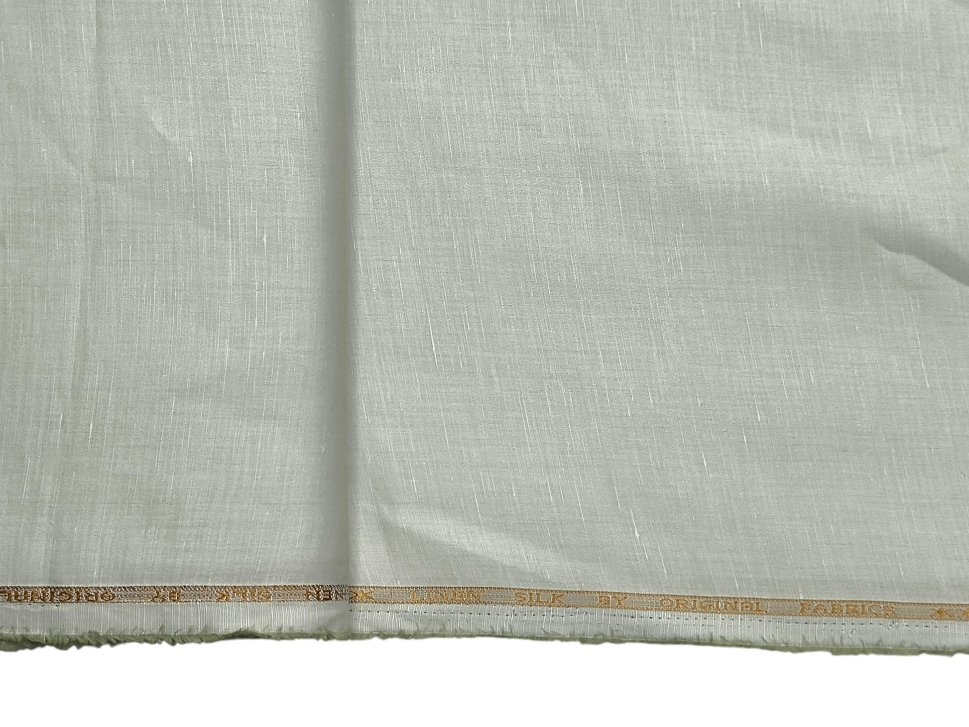 The linen base provides structure, durability, and excellent airflow—perfect for warm-weather wear—while the touch of silk adds a gentle luster and smoother hand feel. The result is a lightweight to midweight fabric with a graceful drape and a crisp yet supple texture.