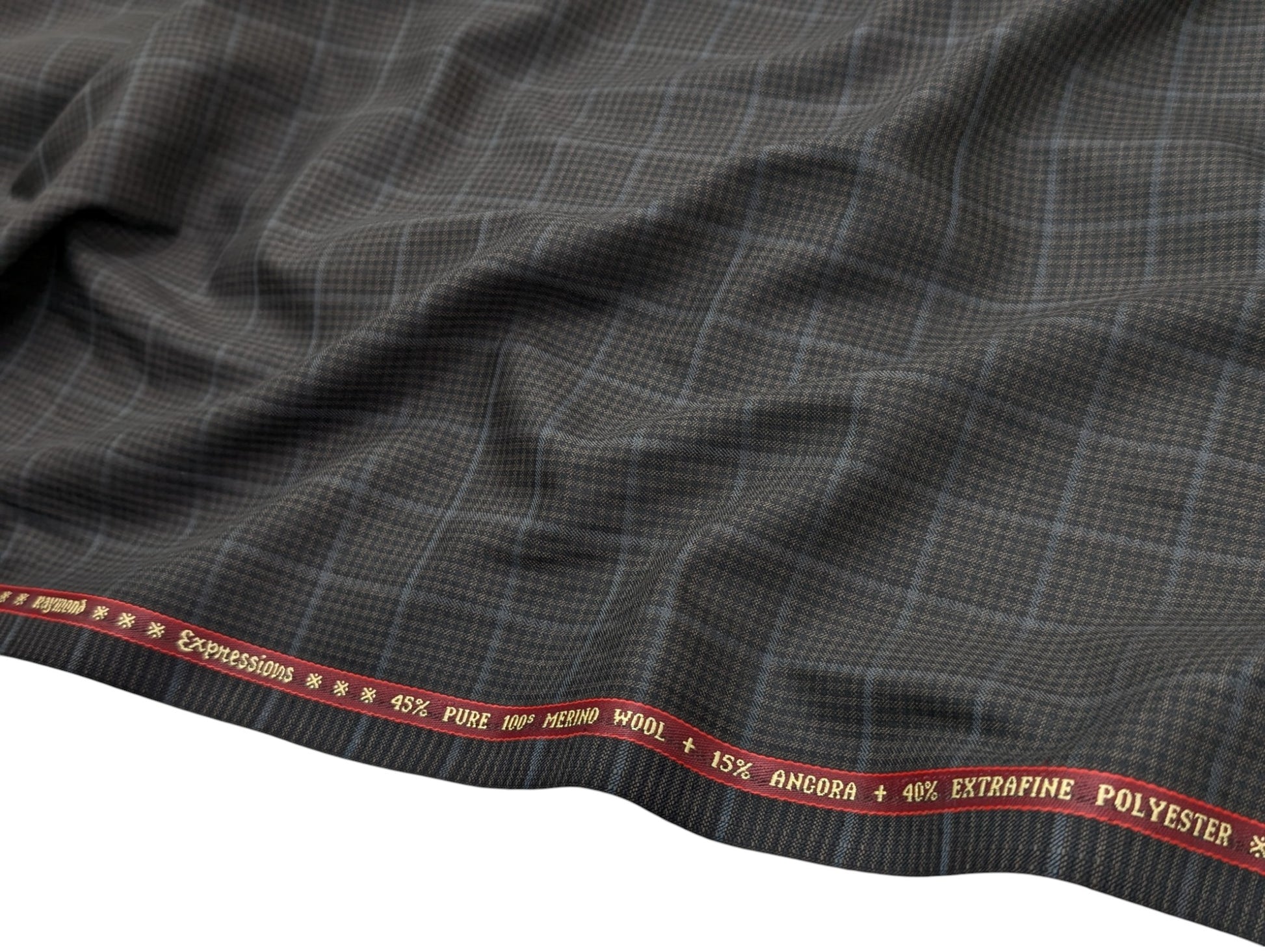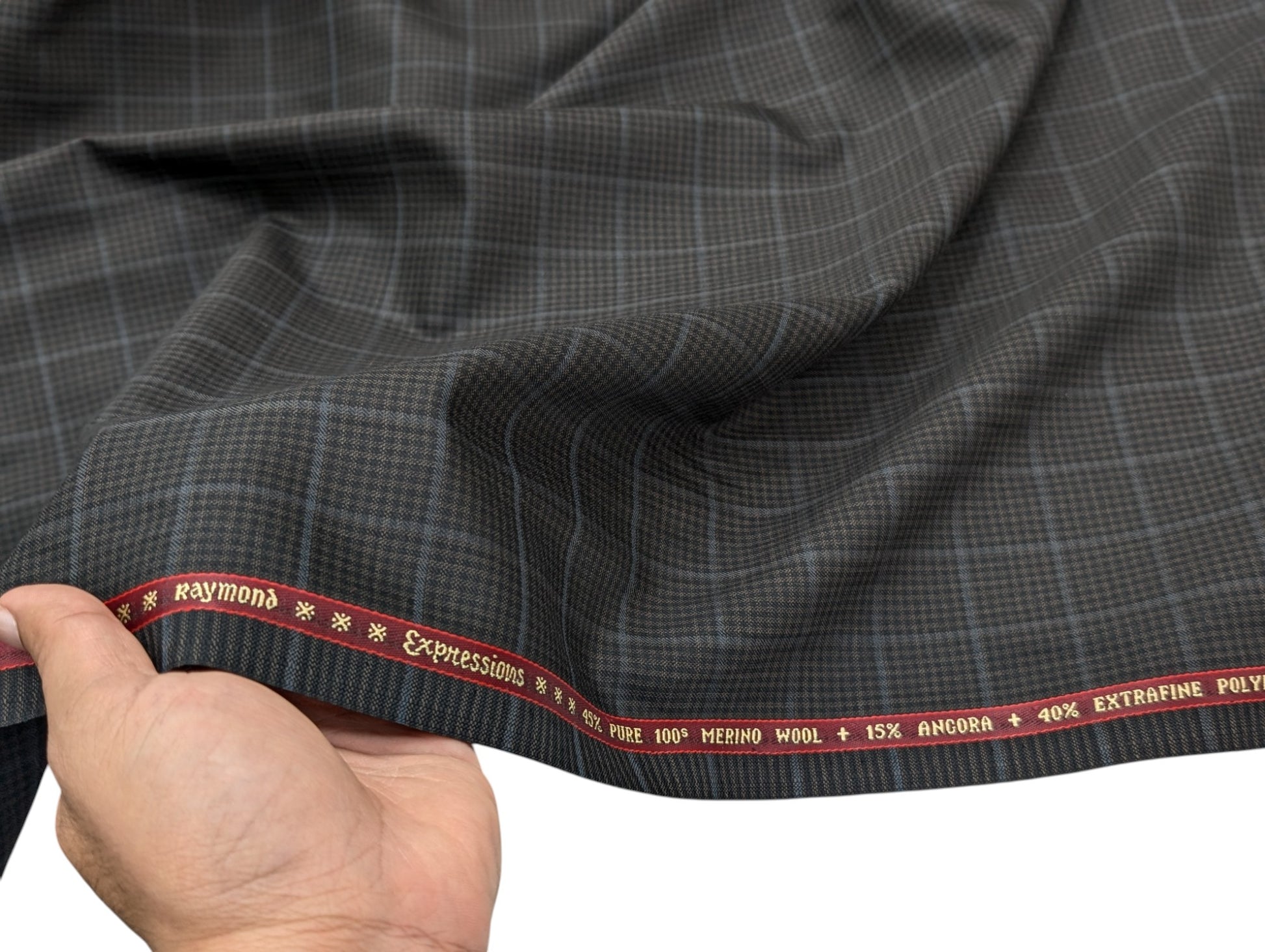 Elevate your wardrobe with this exquisite suiting fabric from the Raymond Expressions collection, woven from a luxurious blend of 45% pure 100’s Merino wool, 15% Angora, and 40% extrafine polyester. This unique mix offers the unmatched softness of Merino, the delicate warmth of Angora, and the durability of premium polyester, ensuring a beautiful drape and long-lasting elegance.