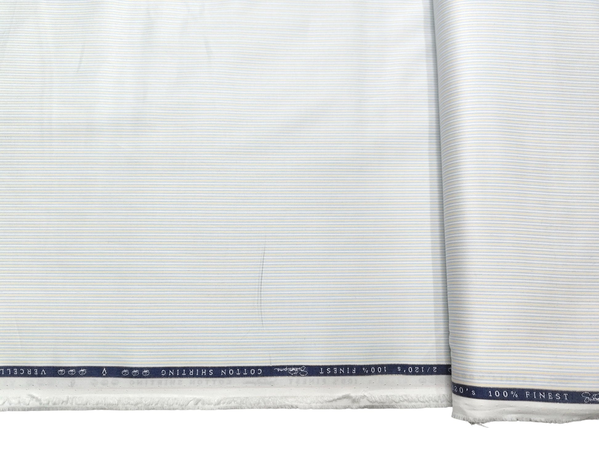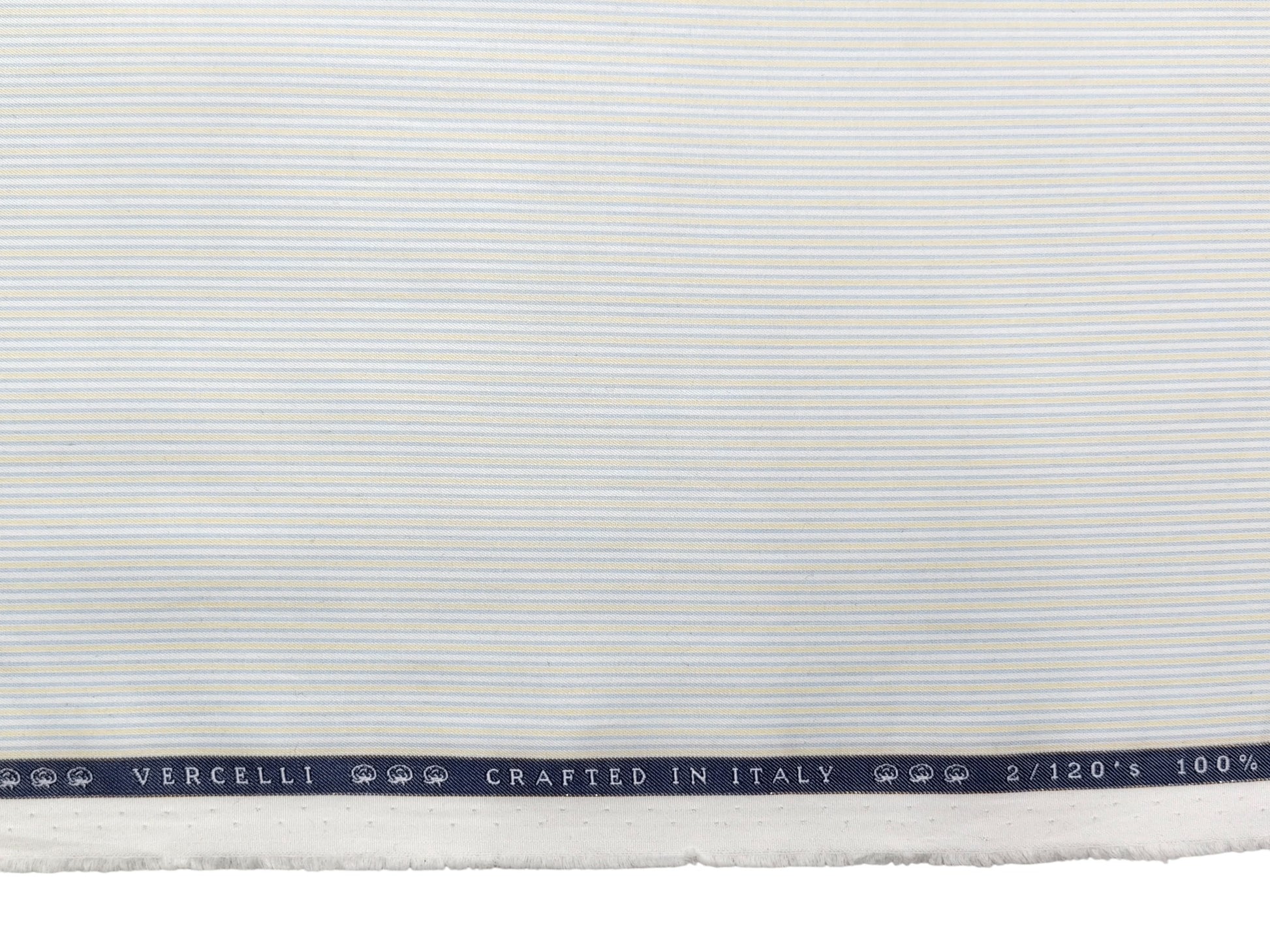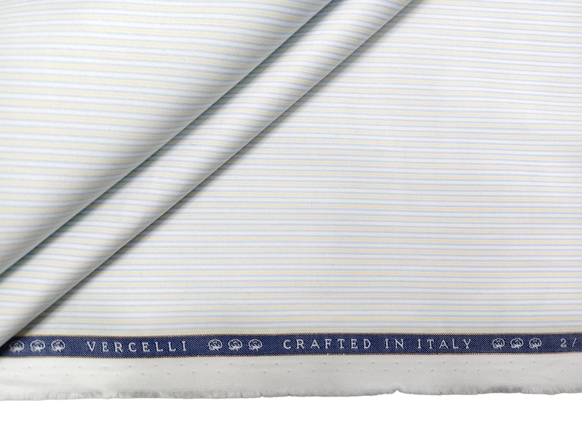 Vercelli Italy 2/120s 100% Pure Cotton Shirting Fabric (White, Blue & Yellow, Stripes)